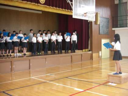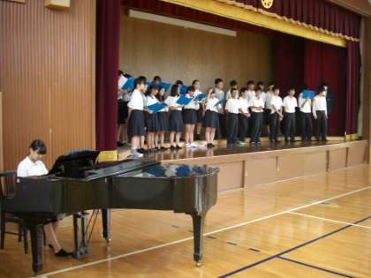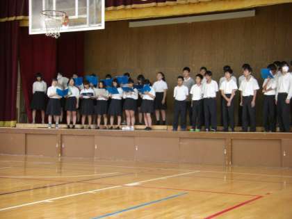写真は2年3組の練習風景です。当日も体育館でコンクールが行われるのでやはり大きな声での歌声が必要です。