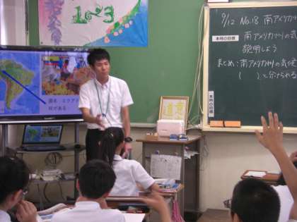 教育実習生の先生の授業も今週で最後となります。今日は1年3組の実習生の先生の研究授業でした。実習生の先生は少し緊張気味でしたが,明るく楽しい授業でした。生徒のみなさんもよくがんばりました。