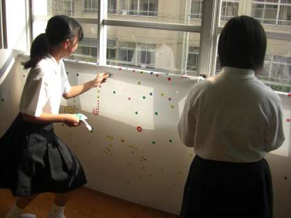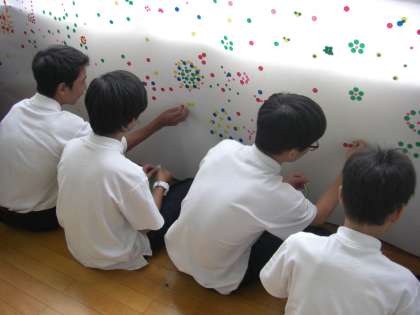 インスタレーションアートに挑戦しています。全校生徒が数枚のシールを模造紙に自由な発想で張り付けていきます。