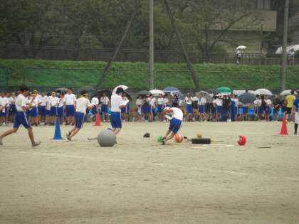 午後からの最初の競技は「借りモノ競争」。このあたりから雨が降り出し,競技中は雨脚が強くなりました。しかし,選手はそんな悪天候に負けないくらいのパワーでした。