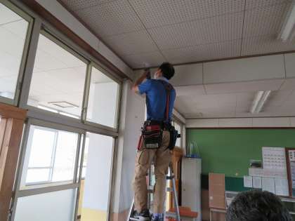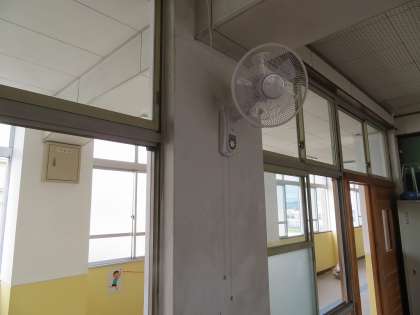 これからマスクを着用した夏が訪れます。授業中,エアコン使用時も一部の窓を開けて空気の入れ替えをするため教室内の温度の上昇が予想されます。熱中症対策として,普通教室と特別教室に扇風機を設置しました。エアコンと扇風機を併用することで生徒の健康と安全を守りたいと思います。業者の方も,マスクを着用しての作業で汗だくになられています。ありがとうございます。