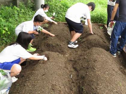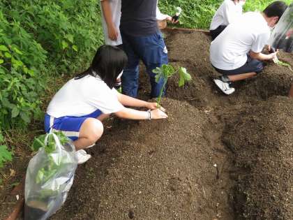 グランドの北東角に1組の菜園があります。今日はきゅうりやプチトマト・とうもろこしなど夏野菜の苗の植付けを行いました。これから毎日水やりをして,おいしい野菜作りをしてください。