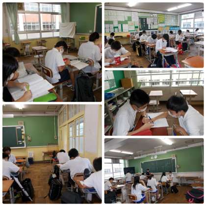 各学年放課後の時間に,テスト前補充学習会が行われています。自分で黙々と取り組んでいる人,分からない問題を質問している人もいました。今年度初めての定期テストとなります。計画立ててしっかりテスト勉強してください。明日は,第1回ノート検定もあります。