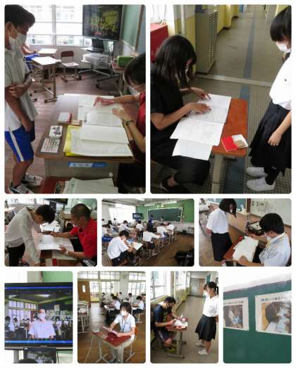 来週の期末テストを控えて「第1回ノート検定」を実施しました。昨年までは体育館で実施しましたが,感染予防対策として,教室でzoomを使用し全校一斉に実施しました。3年生3名が進行し,検定,1級ノートの紹介,課題プリント,最後に3名からの講評で終了しました。全校で一つのことに取り組む姿に感心し,栗陵中学校の生徒の成長と力を感じることができました。講評の一部を紹介します。