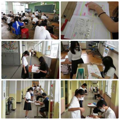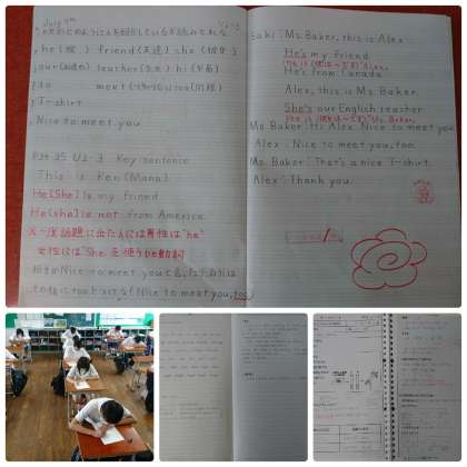 「1年生,初めてのノート検定はどうでしたか?2・3年生は前年度よりもレベルアップしたノートづくりができましたか?今回の検定教科は,英語・理科でしたが,その他の教科に活かせるような点や自分の課題が見つけられたと思います。また,ノート検定の日が近づいてから焦ってノートづくりを始めた人は余裕をもって普段からこつこつと取り組んでいきましょう。」