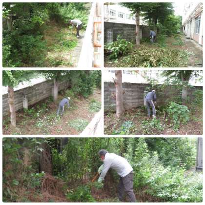 毎年この時期は雑草が伸びる時期ですが,管理用務員さんと校務支援員さんが草刈りをされてます。普段あまり目立たないところまで整備していただき感謝,感謝,ありがとうございます。