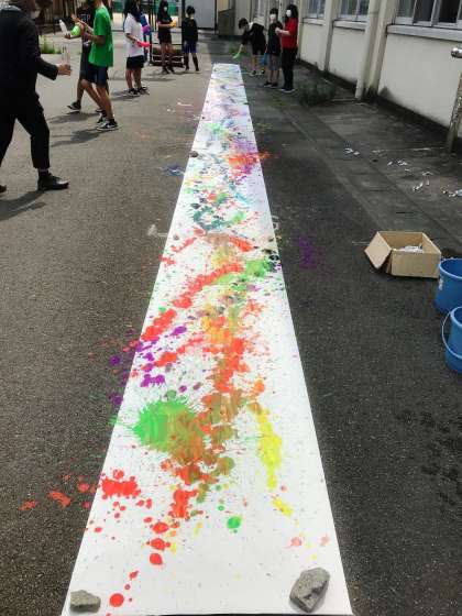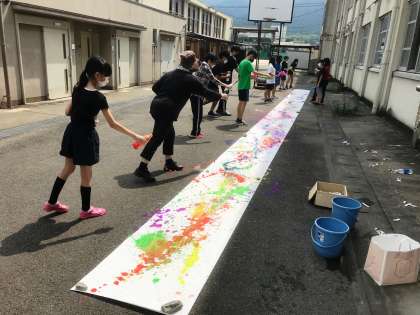 美術部が文化祭にむけて、プール前のスペースを使って、大きな作品に取り組んでいます。