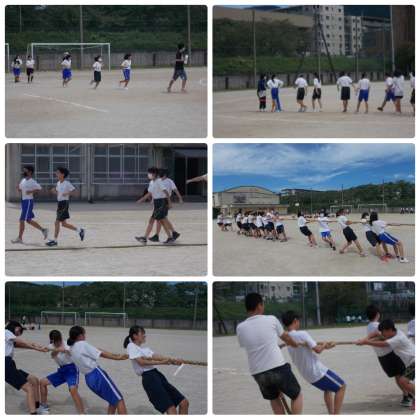 3.4限2年生の学年練習がありました。3限はエントリーの確認をし,4限には,学年種目の綱引きの全体練習でした。青空の下,担任の先生の意気込みが応援に伝わる綱引きでした。
