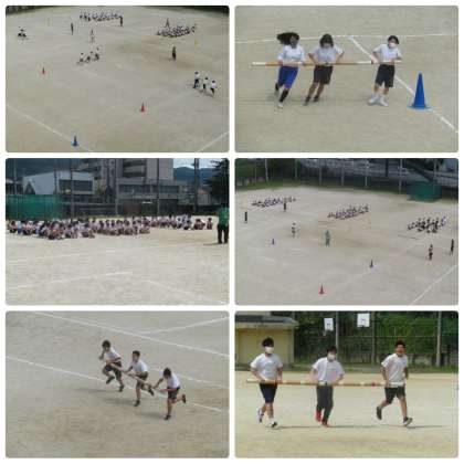 学年体育では,体育祭の1年学年種目「台風の目」を練習しました。1年生らしく元気な姿で本番さながらに取り組んでいました。学年種目を通してクラスの団結力を高めてください。