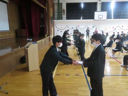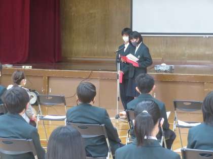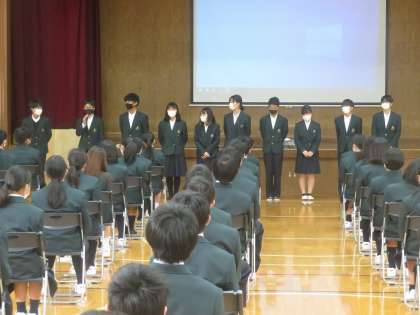 「1年生を迎える会」は,生徒会本部生徒が司会進行しました。自己紹介・各委員会の活動や部活動紹介・記念品贈呈・歓迎の言葉に対して,1年生代表生徒2名から立派な「入学のことば」がありました。312名の新生徒会スタートです。