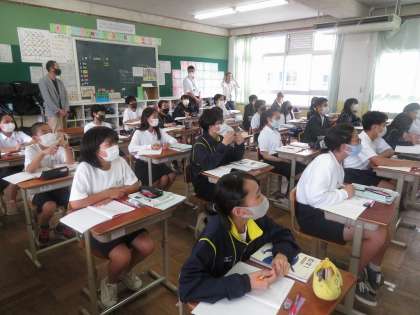 6限昨年の小学校の6年担任の先生方が来校されて1年の授業を参観されました。全体に落ち着いて学習している雰囲気に喜んでおられました。参観後の連絡会では,1年生の先生から入学後の生徒のがんばりを伝えることができました。小学校の先生方,ありがとうございました。