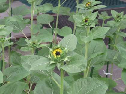 7月に入り蕾が膨らんでいましたが,ついに週末に開花しました。と言っても蕾の中の黄色い花びらが見えてきたところです。今週末には1番ひまわりが咲きそうです。