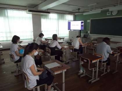 コロナ対策として,密にならないように3教室に分散してオンラインで行いました。