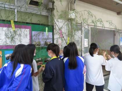 毎年恒例の「七夕」ですが,今年の笹は池田小学校PTA会長様からいただいた立派な笹です。ありがとうございます。立派な笹に呼ばれるかのように生徒が集まり半日で願い事を書いた短冊と家庭科部が作成した飾りがつけられました。明後日の7日は天の川がみられるでしょうか,願い事がかなうといいですね。栗陵中キャラクターの栗ちゃん・陵子ちゃんの七夕バージョンも登場しています。