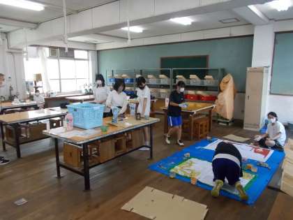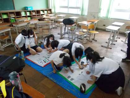 各クラス,午後の時間を使って学級旗の作成をしています。学級目標やクラスで考えたデザインをとりいれ,代表生徒が熱心に取り組んでいます。今後の行事などで使用する予定です。