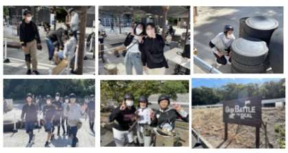 サバイバル体験です。声を掛け合いながらチームの勝利目指して対決しています。盛り上がっていて楽しそうです。