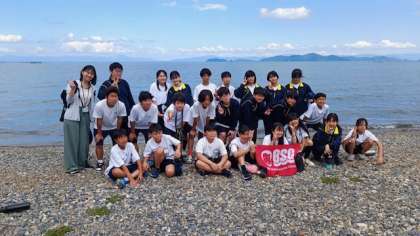 綺麗な琵琶湖、空を背景にクラス写真を撮りました。
