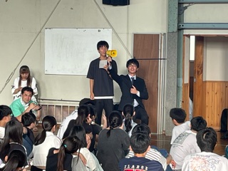 福寿荘体育館に到着しました。この後、レク係が準備してくれた学年レクを行います。