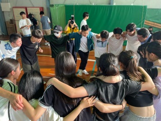 ギネスに挑戦ハイタッチゲームの様子です。一分間動き続けてクラスのみんなとハイタッチしていきます。2組と3組です。