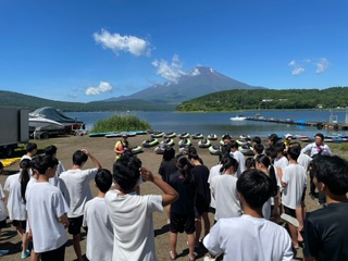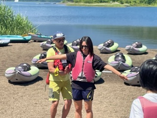 山中湖到着です。ライフジャケットを着用して、
