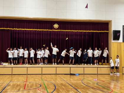 紙飛行機大会が行われ、クラスの各班で作った紙飛行機、