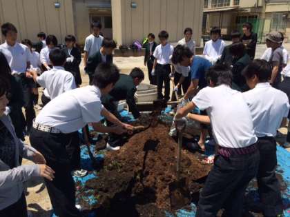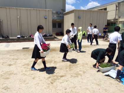 5月21日(木)に生徒会本部役員、2・3年代表委員、1〜3年生生活美化委員54名と有志の生徒で「花いっぱい運動」を実施しました。