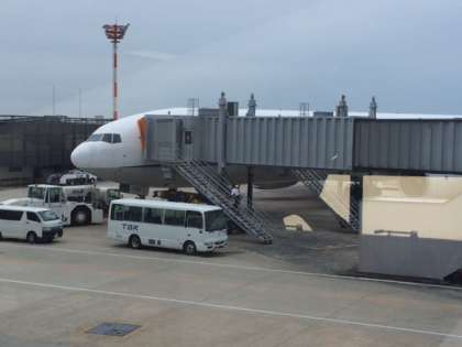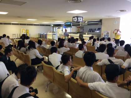 ターミナルに入り、搭乗を待っています。生徒を沖縄まで運んでくれる飛行機も待機しています。