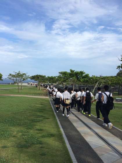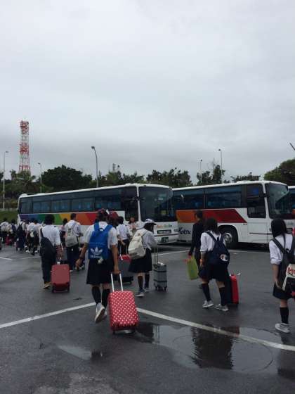 空港に到着し、バスに乗車するときには、予報通り、雨。しかし、平和祈念公園に到着するころには、奇跡の青空が顔を出してくれました。栗陵中学校を歓迎してくれているようです。