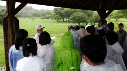 雨の中、小屋で雨をしのいで、説明を聞いています。今から、壕の中へ入ります。