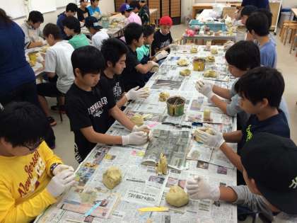 天候不良により、室内での体験学習になりました。漆喰シーサー作りをしているところです。
