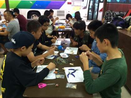 マリンクラフト作りも、地元の方のご指導で、うまくできているようです。細かい作業ですが、みんな真剣に話を聞いて作っているようです。先生も一緒に作っています。