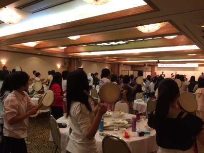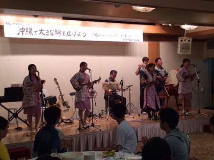 男性は、ドライバーさんです。生徒・ドライバーさん・バスガイドさん一体となってのライブです。曲名は、涙そうそうや島唄。生徒たちもよく知っている曲です。