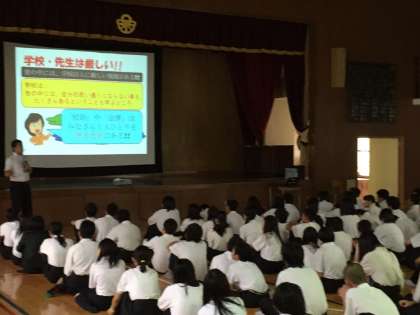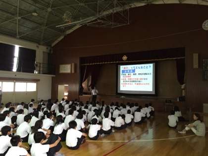 7月7日(火)6限に体育館で2年生対象の「非行防止教室」を実施しました。京都市教育委員会生徒指導課担当課長の石塚宏宣氏を講師にお招きし、「充実した中学校生活を送るために」というテーマでご講演をいただきました。中学生の生活に潜む様々な危険や事件から身を守る方法や周りの人に迷惑をかけないようにするためにはどう行動すればよいのか、また、インターネット・SNS・携帯電話の利用の際に注意しなければならないことなどを中心に中学生を取り巻く社会の状況について幅広い視点からわかりやすくお話ししていただきました。最後に『「ルール」「マナー」「きまり」を守って楽しく充実した中学校生活を送ってください』というメッセージをいただきました。