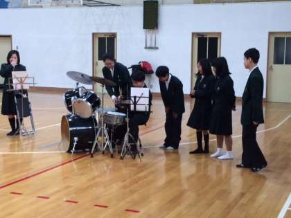 吹奏楽部の楽器体験では、ドラムスにチャレンジしてもらいました。家庭部の紹介。