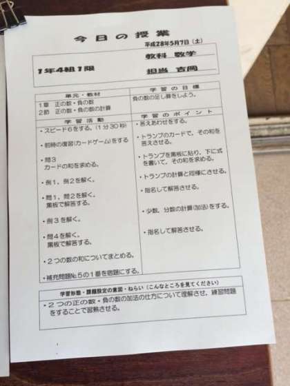 1年生の数学、社会の授業です。授業の略案を学級ごとに配布しました。授業の見どころなどを提示しました。
