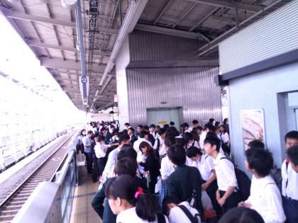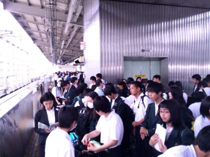 ホームで新幹線の到着を待っています。しおりを手にこれからの行程を確認している人もいます。