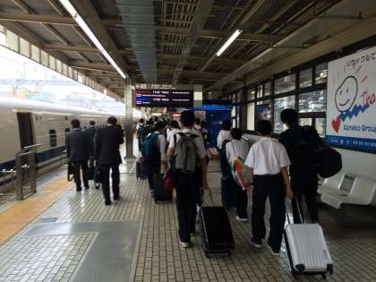 静岡駅に到着し、自然体験学習に向かうバスを待っています。一日目のメインの活動は、ラフティング・マウンテンバイク・カヌー・樹海と洞窟体験に分かれての自然体験です。豊かな自然に触れ合いながら、安全に留意しながら、楽しい体験にしてください。