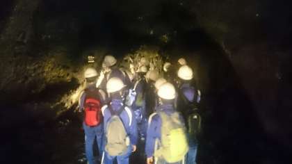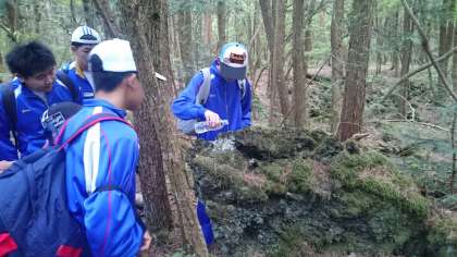 樹海探検男子の様子です。こうもりのいる洞窟に入ったり、樹海では、溶岩に水をかけたり、方位磁石で実験をしたりしました。いろいろな説明をしていただいたようで興味深く聞いていたようです。