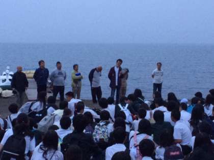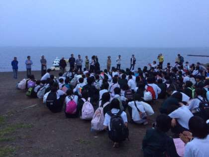 入村式です。辺りも薄暗くなり、昼間とは違った顔を見せています。生徒の皆さんは、自然体験で思う存分楽しむことができたでしょうか。普段とは、ちがう場所で違う雰囲気の中で仲間と過ごす時間は、格別だと思います。今まで気が付かなかった良いところも見つけたのではないでしょうか。中には、疲れたのか移動のバスの中で眠っている人もいたようです。宿泊先のペンションでおいしいものを食べて、ゆっくり疲れを癒し、明日に備えてください。
