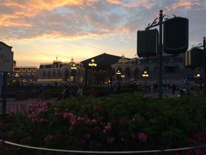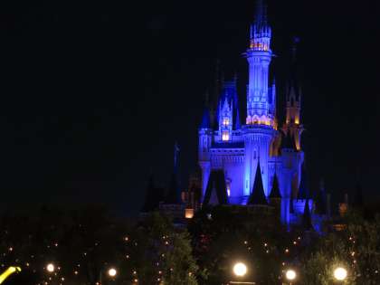 夕闇に浮かぶディズニーランドとライトアップされたシンデレラ城です。いつ見てもきれいですね。仲間と過ごすとても楽しい時間となるでしょう。そろそろパレートも始まるのでしょうか?