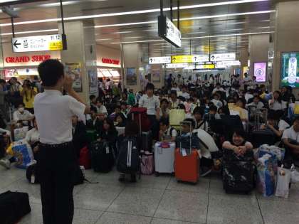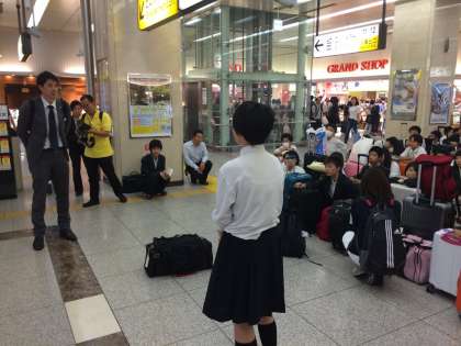 京都駅に到着し、解団式を行っています。実行委員代表の終わりの言葉、写真屋さんや添乗員さんへのお礼の言葉、校長先生の言葉、諸注意です。
