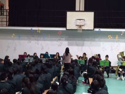 入場後は、生徒会本部の寸劇「栗太郎」、吹奏楽部の演奏と和やかな雰囲気で進行しました。生徒会本部のメンバー紹介や生徒代表から新入生を歓迎することばがありました。
