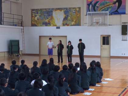 4月13日(木)5・6限、1年生は体育館にて、部活紹介がありました。2・3年生の各部の代表が、活動の説明や模範演技を行いました。1年生の中から、先輩に誘われ、みんなの前で、体験した人もありました。