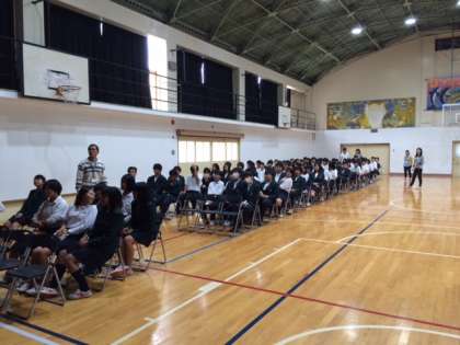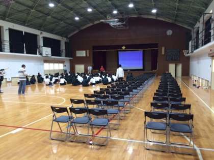 体育館に並べられた椅子に座っているのは、新幹線の乗車隊形から乗り込む練習です。1分以内で安全に乗り込めるように真剣に練習しました。当日は大きな荷物も持っていますので、協力してください。