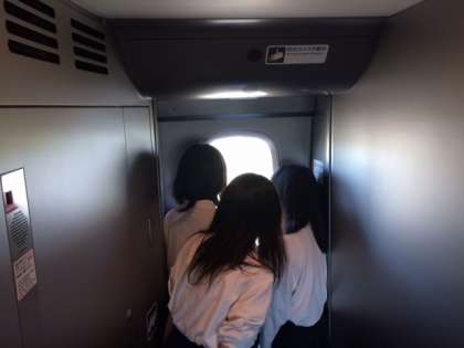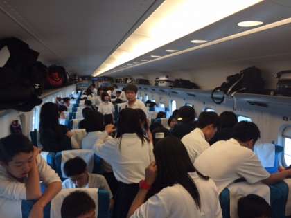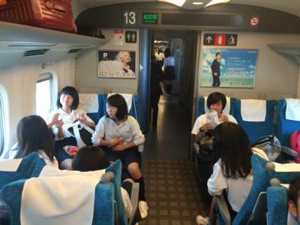 新幹線車内の様子その1。おやつを食べたり、ゲームをしたり、車窓から景色を眺めたり、貸し切り車内を思う存分楽しんでいるようです。