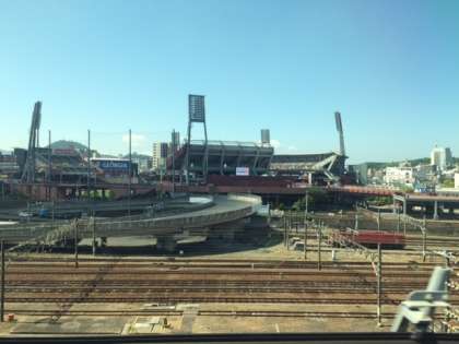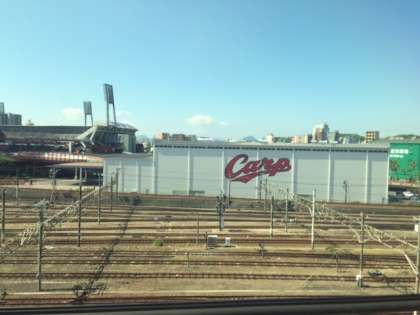広島到着。広島カープの本拠地、マツダスタジアムです。あと、一時間ほどで博多に到着です。