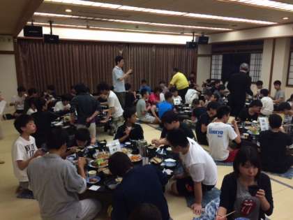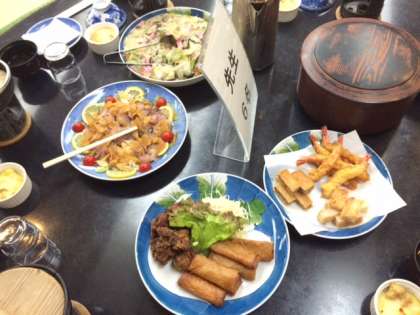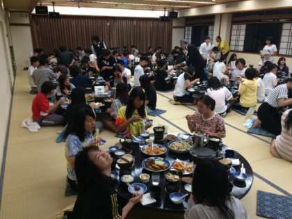 昨日の夕食風景です。ホテルは、テーブル食が多いのですが、大広間で食卓を囲んでの食事は、話もはずんで楽しかったようです。食事もボリュームたっぷりで大満足のようでした。