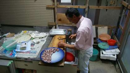 民泊の方がアジの刺身を作っておられるところです。今日の晩御飯でしょうか?