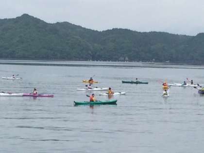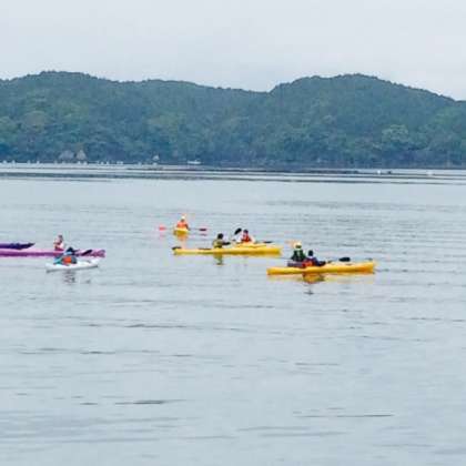 シーカヤック体験。雨の中ですが、順調に活動できているようです。