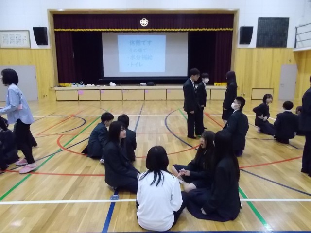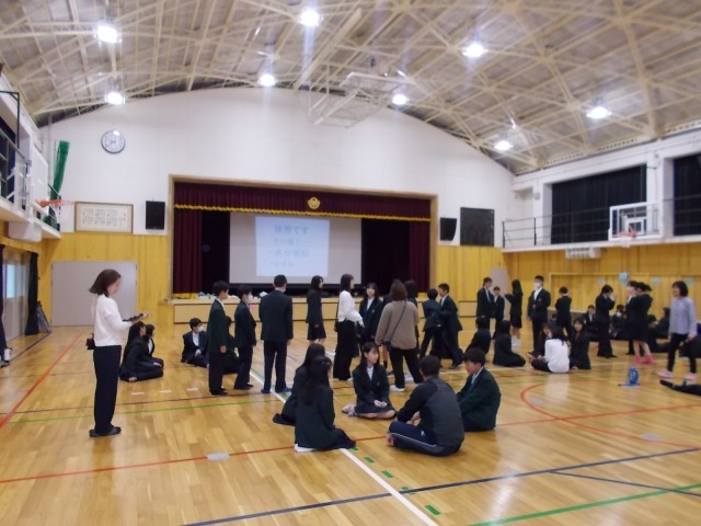 登校2日目の今日、1年生は1限から学年集会、仲間づくりのワークショップをしています。